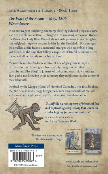 The Feast of the Swans - May, 1306 Westminster In an extravagant knighting ceremony, old King Edward prepares a new army to march on Scotland - charged with wreaking revenge on Robert the Bruce. For Lady Illesa Burnel, there's little pleasure in watching her son knighted simply to become fodder for the battlefield. But amongst the revellers at the feast is a mercurial stranger who resembles a long-lost friend. In the days that follow, a sequence of fateful decisions drives Illesa, and all her family, to the brink of ruin. Meanwhile in Hereford, the creator of one of the greatest maps in Christendom is planning a subversive pilgrimage. When their paths cross, he and Illesa begin a journey of twists and turns, down strange, dark paths, not knowing what adversary they might meet at the centre of their labyrinth. Inspired by the Mappa Mundi of Hereford Cathedral, this final book in The Arrowsmith Trilogy brings the reader into its world of marvels and monsters, heights and depths, redemption and damnation. "A skilfully woven tapestry of historical fact and captivating story-telling that leaves the reader begging for more adventures." Karen Maitland - on All the Winding World