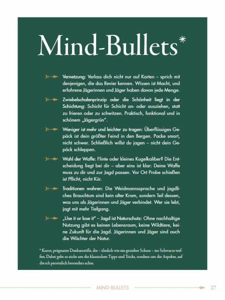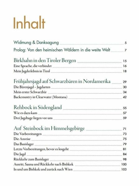 Eine leidenschaftliche Jägerin hat ihr Hobby zum Beruf gemacht: Als Eigentümerin einer Firma, die exklusive Jagdreisen organisiert, begleitet sie ihre Kunden als Jagdleiterin. In ihrem Buch erzählt sie von ihrem Faible für die Jagd von Kindheit an. Sie ist Mitpächterin in ihrem Heimatrevier in Niederösterreich, liebt aber auch die Jagd in den Bergen. Hauptsächlich schildert sie jedoch die Meilensteine ihrer persönlichen jagdlichen Auslandserfahrung, wie eine Steinbockjagd in Kirgisistan, Jagden auf Schwarzbären in Idaho und Montana oder eine spanische "Montería" (eine groß angelegte Treibjagd auf iberisches Rotwild, Schwarz-, Muffel- und Damwild) und viele weitere beeindruckende Erlebnisse. Zusätzlich gibt es interessante Tipps und wissenswerte Informationen über die Jagd im Ausland. Thematisiert werden auch ethische Fragen zur Auslandsjagd und wie es um die Zukunft der Jagd im In- und Ausland steht.