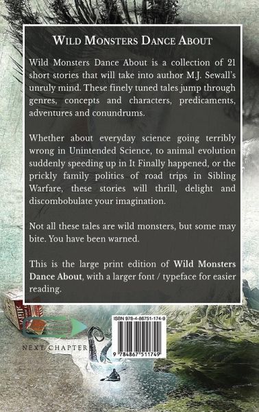 Wild Monsters Dance About is a collection of 21 short stories that will take into author M.J. Sewall's unruly mind. These finely tuned tales jump through genres, concepts and characters, predicaments, adventures and conundrums. Whether about everyday science going terribly wrong in Unintended Science, to animal evolution suddenly speeding up in It Finally happened, or the prickly family politics of road trips in Sibling Warfare, these stories will thrill, delight and discombobulate your imagination. Not all these tales are wild monsters, but some may bite. You have been warned. This is the large print edition of Wild Monsters Dance About, with a larger font / typeface for easier reading.