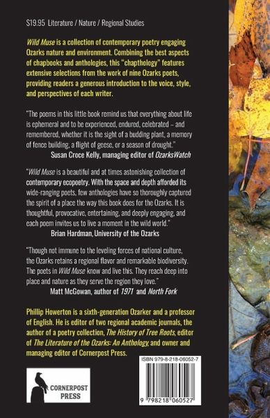 Wild Muse is a collection of contemporary poetry engaging Ozarks nature and environment. Some topics and themes explored here are nature's beauty, sense of place, loss of place, environmental diminishment, and human dependence on nature and its sublime indifference to our existence. Combining the best aspects of chapbooks and anthologies, this "chapthology" features extensive selections from the work of nine Ozarks poets (C. D. Albin, Wendy Taylor Carlisle, Paulette Guerin, John J. Han, Phillip Howerton, Gerry Sloan, Mark Spitzer, Agnes Vojta, and Amy Wright Vollmar) providing readers a generous introduction to the voice, style, and perspectives of each writer. In total, this collection presents almost 200 poems and offers biographical material about each poet, discussion of some poems included, and advice and insights about writing nature-based poetry.