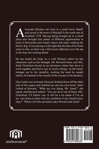 Alexander Buchan was born in a small town, Banff, and raised in the town of Macduff in the north east of Scotland 1978. Having being brought up in a small place also brought him plenty of different opportunities to learn to draw/paint and respect nature and enjoy walking the family dog. It was during a cold night that the idea of his book came to him, as there was a full-moon reflection over the sea as his dog was running ahead. He has based the book on a wild Western where he has characters such as the Stranger, Mr. Howard Jones, and Mrs. Juliet Nicholson bound on an adventure where they have to work together and find a way to resolve things. As the lonely stranger sat by his campfire, cooking the meal he caught earlier, he listened to the sounds of the coyotes in the distance. Once Juliet was on board, Howard climbed down off the other side of the wagon and climbed up onto his own horse. Juliet looked at Howard. "What are you doing, Mr. Jones?" she asked, and Howard replied, "You can drive one of these, Mrs. Nicholson, I'll follow you. It will be a lot easier if I'm on my own horse to deal with any problems if any should arise, okay?" Where will this adventure take Howard and Juliet?