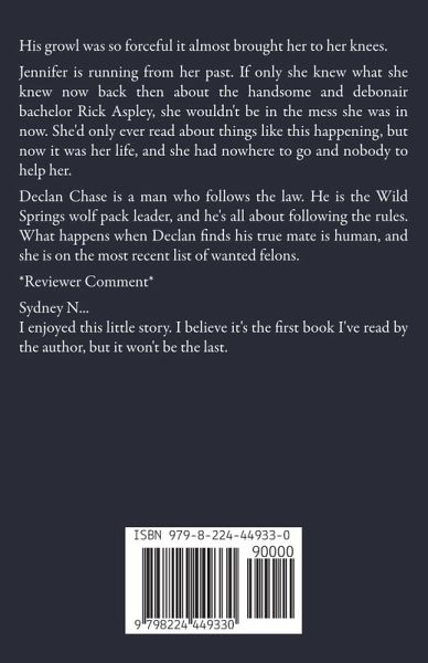 His growl was so forceful it almost brought her to her knees. Jennifer is running from her past. If only she knew what she knew now back then about the handsome and debonair bachelor Rick Aspley, she wouldn't be in the mess she was in now. She'd only ever read about things like this happening, but now it was her life, and she had nowhere to go and nobody to help her. Declan Chase is a man who follows the law. He is the Wild Springs wolf pack leader, and he's all about following the rules. What happens when Declan finds his true mate is human, and she is on the most recent list of wanted felons. *Reviewer Comment* Sydney N... I enjoyed this little story. I believe it's the first book I've read by the author, but it won't be the last.