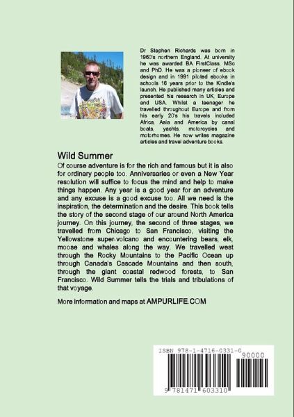 'Wild Summer' is the second travel-adventure book by Stephen Richards where he uses his own brand of nostalgia, humour and keen observation. It is the true story of an adventure road-trip around the USA in one year. On this journey, the second of three adventures, a UK couple travel from Chicago to San Francisco, exploring the Yellowstone super-volcano and encountering bears, elk, moose and whales along the way. They travelled west through the Rocky Mountains to the Pacific Ocean up through Canada's Cascade Mountains and then south, through the giant coastal redwood forests, to San Francisco. 'Wild Summer' tells the trials and tribulations of the voyage. See AmpUrLife.com for more information.