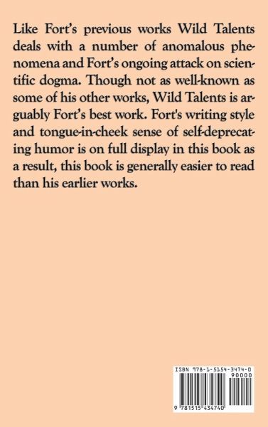 Like Fort's previous works Wild Talents deals with a number of anomalous phenomena and Fort's ongoing attack on scientific dogma. Though not as well-known as some of his other works, Wild Talents is arguably Fort's best work. Fort's writing style and tongue-in-cheek sense of self-deprecating humor is on full display in this book as a result, this book is generally easier to read than his earlier works.