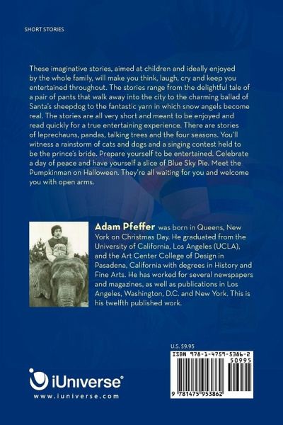 These imaginative stories, aimed at children and ideally enjoyed by the whole family, will make you think, laugh, cry and keep you entertained throughout. The stories range from the delightful tale of a pair of pants that walk away into the city to the charming ballad of Santa's sheepdog to the fantastic yarn in which snow angels become real. The stories are all very short and meant to be enjoyed and read quickly for a true entertaining experience. There are stories of leprechauns, pandas, talking trees and the four seasons. You'll witness a rainstorm of cats and dogs and a singing contest held to be the prince's bride. Prepare yourself to be entertained. Celebrate a day of peace and have yourself a slice of Blue Sky Pie. Meet the Pumpkinman on Halloween. They're all waiting for you and welcome you with open arms.