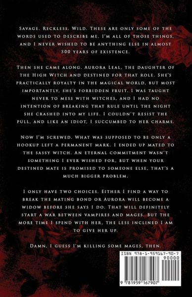 Savage. Reckless. Wild. These are only some of the words used to describe me. I'm all of those things, and I never wished to be anything else in almost 500 years of existence. Then she came along. Aurora Leal, the daughter of the High Witch and destined for that role. She's practically royalty in the magical world, but most importantly, she's forbidden fruit. I was taught never to mess with witches, and I had no intention of breaking that rule until the night she crashed into my life. I couldn't resist the pull, and like an idiot, I succumbed to her charms. Now I'm screwed. What was supposed to be only a hookup left a permanent mark. I ended up mated to the sassy witch. An eternal commitment wasn't something I ever wished for, but when your destined mate is promised to someone else, that's a much bigger problem. I only have two choices. Either I find a way to break the mating bond or Aurora will become a widow before she says I do. That will definitely start a war between vampires and mages. But the more time I spend with her, the less inclined I am to give her up. Damn, I guess I'm killing some mages, then.