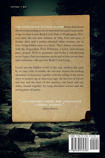 The anonymous author discovers the most astonishing secret in American literature, complete with priceless manuscripts, in Rock Creek Park in Washington, D.C. Walt Whitman's shocking secret story and the evidence that proves it have been kept under wraps ever since the war-torn summer of 1864. Ezra and June, a former slave and a poetry-obsessed white woman, are in love, hidden away in a shack. Their chance encounter with the despondent Walt Whitman, at that time a failed, little-known poet, sends Whitman on his way to greatness and births a still-thriving secret legacy that grows to encompass poets and writers across time and continents—the peerless Rock Creek Gang. Lured into the hidden world of the vast, modern-day park by its zany tribe of misfits, the narrator weaves his madcap adventure of discovery along with his telling of Whitman's secret story to conjure up an American saga: the horrors of slavery and war and the story of two families, one black and one white, bound together by Whitman's long-cherished secrets and the saving grace of poetry. In the present day, the heroes of this vividly imagined novel, a ne'er-do-well booklover obsessed with John Keats and a wizened, homeless black man who recites Langston Hughes, connive to reveal Whitman's closely guarded secrets and the strange, hidden world of Rock Creek Park. At stake is Whitman's true legacy and the fate of the narrator and his fellow Rock Creek secret-keepers. The novel will delight and surprise non-poetry fans as well as poetry enthusiasts (poetry is experiencing a comeback!), particularly fans of Whitman and the Rock Creek Gang who share his secret legacy: John Keats, Edna St. Vincent Millay, Emily Dickinson, Richard Brautigan, Roberto Bolaño and Langston Hughes. The first-ever novel set in Rock Creek Park will also appeal to fiction readers among the two million annual visitors to the country's largest urban park. Wild Walt and the Rock Greek Gang is a modern-day Dead Poets Society turned on its precious head. A diverse cast of misfit under-represented characters, not at a prep school but in a gritty, hidden world smack dab in the middle of Washington, D.C., give it the same broad appeal—the power of poetry brought to life for general non-poetry readers. It is a modern American version of literary discovery novels like bestsellers Possession and People of the Book.