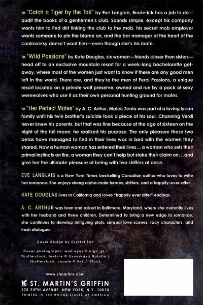 THREE SMOKING HOT SHIFTER STORIES, INCLUDING ONE BY EVE LANGLAIS, PACKED INTO ONE SIZZLING ANTHOLOGY! A brand new, never before published novella! In Catch a Tiger by the Tail by Eve Langlais, Broderick has a job to do-audit the books of a gentleman's club. Sounds simple, except his company wants him to find dirt linking to the mob, his secret mob employer wants someone to pin the blame on, and the bar manager at the heart of the controversy doesn't want him-even though she's his mate. Previously published in the 2-in-1 e-original Claimed by the Mate, Vol. 2 and in print for the first time! In Wild Passions by Kate Douglas, six women-friends closer than sisters-head off to an exclusive mountain resort for a week-long bachelorette getaway, where most of the women just wants to know if there are any good men left in the world. There are, and they're the men of Feral Passions, a unique resort located on a private wolf preserve, owned and run by a pack of sexy werewolves who use it as their own personal hunting ground for mates. In Her Perfect Mates by A.C. Arthur, Malec Zenta was part of a loving lycan family until his twin brother's suicide took a piece of his soul. Channing Verdi never knew his parents, but that was fine because at the age of sixteen on the night of the full moon, he realized his purpose. The only pleasure these two betas have managed to find in their life was in the bed with the women they shared. Now, a human woman has entered their lives...a woman who sets their primal instincts on fire, a woman they can't help but stake their claim on...and give her the ultimate pleasure of being with two shifters at once.