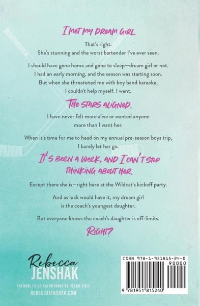 I met my dream girl. That's right. She's stunning and the worst bartender I've ever seen. I should have gone home and gone to sleep-dream girl or not. I had an early morning and the season was starting soon. But when she threatened me with boy band karaoke I couldn't help myself. I went. The stars aligned. I have never felt more alive or wanted anyone more than I want her. When it's time for me to head on my annual pre-season boys trip, I barely let her go. It's been a week and I can't stop thinking about her. Except there she is. Right here at the Wildcat's kickoff party. And as luck would have it, my dream girl is the coach's youngest daughter. But everyone knows the coach's daughter is off limits. Right? Wildcat is a full-length sports romance with a hot-as-puck hero, the coach's daughter, and an unfortunate case of mistaken identity.