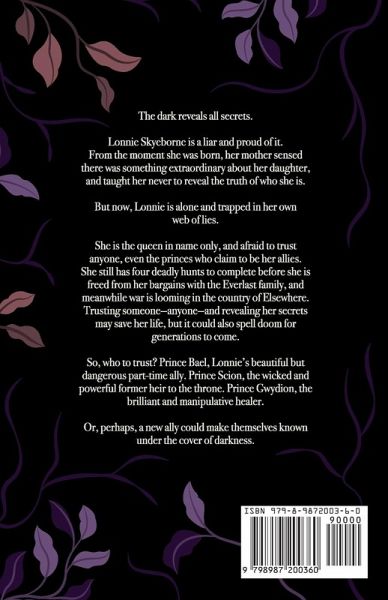 The dark reveals all secrets. Lonnie Skyeborne is a liar and proud of it. From the moment she was born, her mother sensed there was something extraordinary about her daughter, and taught her never to reveal the truth of who she is. But now, Lonnie is alone and trapped in her own web of lies. She is the queen in name only, and afraid to trust anyone, even the princes who claim to be her allies. She still has four deadly hunts to complete before she is freed from her bargains with the Everlast family, and meanwhile war is looming in the country of Elsewhere. Trusting someone--anyone--and revealing her secrets may save her life, but it could also spell doom for generations to come. So, who to trust? Prince Bael, Lonnie's beautiful but dangerous part-time ally. Prince Scion, the wicked and powerful former heir to the throne. Prince Gwydion, the brilliant and manipulative healer. Or, perhaps, a new ally could make themselves known under the cover of darkness. The dark reveals all secrets. Lonnie Skyeborne is a liar and proud of it. From the moment she was born, her mother sensed there was something extraordinary about her daughter, and taught her to never reveal the truth of who she is. But now, Lonnie is alone and trapped in her own web of lies. She is the queen in name only, and afraid to trust anyone, even the princes who claim to be her allies. She still has four deadly hunts to complete before she can escape her bargains with the Everlast family, and meanwhile war is looming in the country of Elsewhere. Trusting someone-anyone-and revealing her secrets may save her life, but it could also spell doom for generations to come. So, who to trust? Prince Bael, Lonnie's beautiful but dangerous part-time ally. Prince Scion, the wicked and powerful former heir to the throne. Prince Gwydion, the brilliant and manipulative healer. Or, perhaps, a new ally could make themselves known under the cover of darkness.