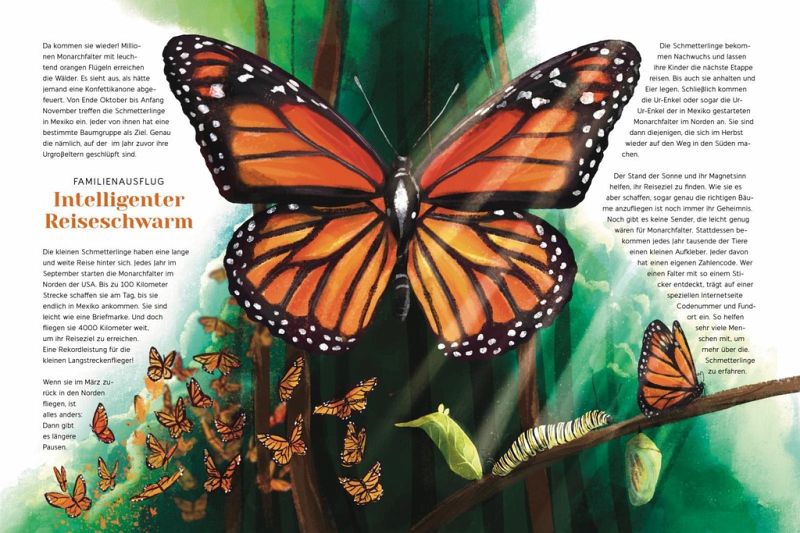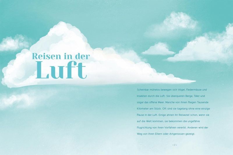 Rund um den Globus begeben sich jedes Jahr Milliarden von Tieren auf spektakuläre, und oft gefährliche Reisen: Hoch oben in den Lüften legen Zugvögel tausende von Kilometern zurück, um den Winter im Süden zu verbringen. In der Savanne ziehen große Herden von Elefanten und Gnus auf Nachrungssuche. Und in den Flüssen und Ozeanen legen Fische und Wale mitunter abenteuerliche Wege zurück, um den Nachwuchs sicher auf die Welt zu bringen. In diesem Sachbuch folgen Kinder den faszinierenden Reiserouten von über 20 Säugetieren, Vögeln, Fischen, Reptilien und Insekten. Und sie lernen die individuellen Wanderungen einzelner Tiere kennen, die Forschende mithilfe von GPS-Daten und Beobachtungen dokumentieren konnten. So begleiten die jungen Leser_innen etwa die Störchin Eva auf ihrem Weg nach Tansania, folgen Polarfüchsin Anna über das Polareis und erfahren mehr über die Weltreise von Buckelwalmutter Theresia und ihrem Baby.