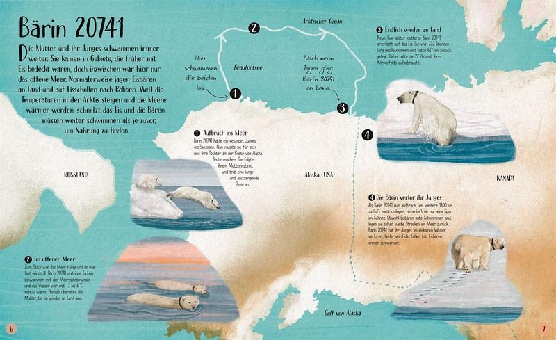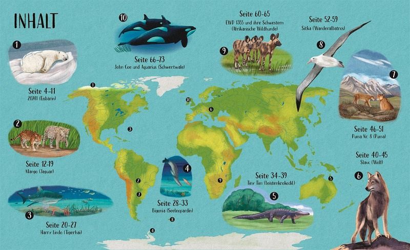 Dieses besondere Kindersachbuch erzählt die Abenteuer von 10 echten Tieren. Mit John Coe, dem Orca, durchqueren die Kinder die Irische See, fiebern in Afrika mit Wildhündin EWD 1355 und ihren Schwestern, die vor Wilderern flüchten müssen, und begleiten Wolf Slavc auf seiner langen Wanderung von Slowenien nach Italien. Über viele Jahre haben Forschungsteams mit GPS-Trackern die eindrucksvollen Routen der Tiere aufgezeichnet, die Kinder hier auf Karten verfolgen können. Die wahren Tiergeschichten geben zusammen mit den tollen Fotos und stimmungsvollen Illustrationen nie gesehene Einblicke in das Leben der Wildtiere. Dazu wird viel Wissenswertes über die Arbeit von Forschenden berichtet und Kinder verstehen, warum wir Umwelt und Tiere schützen müssen. Ein ganz besonderes, emotional erzähltes Kinderbuch über Tiere, das sich auch wunderbar zum Vorlesen eignet.