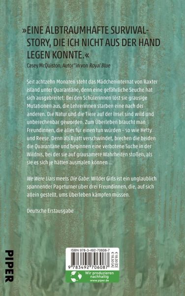 machen brutale Verwandlungen durch und leiden zusätzlich auch noch unter großem Hunger – denn die…mehrWilder Girls ist ein Roman, der besonders ist. Die Thematik passt wie die Faust aufs Auge in die aktuelle Zeit. Ein Mädcheninternat steht unter Quarantäne, eine grausame Krankheit scheint sich unter den Schülerinnen ausgebreitet zu haben. Und die Lage ist ernst: Lehrerinnen und Schülerinnen sterben, machen brutale Verwandlungen durch und leiden zusätzlich auch noch unter großem Hunger – denn die Essenlieferungen vom Festland fallen mager aus. So roh und grausam diese Lage ist, so nackt und ungeschmückt ist auch der Schreibstil der Autorin: Rory Power erzählt die Geschichte dreier Freundinnen in diesem Internat ohne große Metaphern oder sprachliche Ausschmückungen. Die Bilder, die sie schafft, sind nichts für schwache Nerven! Ich als Thrillererprobte Person musste so einige Male tief durchatmen, damit mir nicht übel wird bei den detaillierten Beschreibungen mancher Situationen. Die Triggerwarnung am Ende das Buches ist also wirklich notwendig gewesen. Doch diese Grausamkeit unterstreicht nur die aktuelle Situation im Internat und zeichnet ein gutes Bild der Realität, ohne etwas zu schönen. In mir kam mehr und mehr Respekt für die Mädchen auf, die sich in einer solchen Welt behaupten können. Alle drei Protagonistinnen – Reese, Hetty und Byatt – sind auf ihre eigene Art und Weise unglaublich stark und leisten Großartiges. Sie stützen sich gegenseitig und helfen einander, auch wenn es immer wieder zu schwierigen und konflikteichen Situationen kommt. Gerade am Anfang ist es schwer, eine echte Freundschaft der Drei zu erkennen, denn ihre Handlungen entsprechen nicht immer dem, was wir unter Freundschaft verstehen würden. Erst gegen Ende wird klar, wie viel die Freundinnen einander bedeuten. Der Überlebenskampf auf der Insel hat sie zu dem gemacht, was sie sind – das wird mehrfach deutlich. Ihre Vergangenheit lässt sie nicht los, doch die Realität holt sie immer wieder zurück.