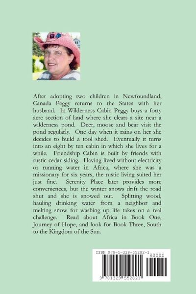 After adopting two children in Newfoundland, Canada Peggy's Journey of Hope leads to the back woods of northern Minnesota where she builds a rustic cabin with the help of friends. The cabin is situated on forty acres with a small duck pond. She lives without electricity or running water and finds daily encounters with wild animals: deer, moose and even bear. Look for Book Three in the Journey of Hope Series, South to the Kingdom of the Sun.