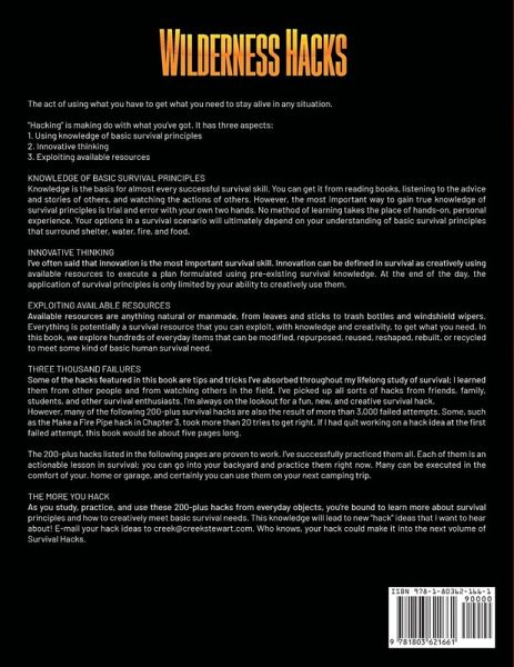 KNOWLEDGE OF BASIC SURVIVAL PRINCIPLESKnowledge is the basis for almost every successful survival skill. You can get it from reading books, listening to the advice and stories of others, and watching the actions of others. However, the most important way to gain true knowledge of survival principles is trial and error with your own two hands. No method of learning takes the place of hands-on, personal experience. Your options in a survival scenario will ultimately depend on your understanding of basic survival principles that surround shelter, water, fire, and food.INNOVATIVE THINKINGI've often said that innovation is the most important survival skill. Innovation can be defined in survival as creatively using available resources to execute a plan formulated using pre-existing survival knowledge. At the end of the day, the application of survival principles is only limited by your ability to creatively use them.EXPLOITING AVAILABLE RESOURCESAvailable resources are anything natural or manmade, from leaves and sticks to trash bottles and windshield wipers. Everything is potentially a survival resource that you can exploit, with knowledge and creativity, to get what you need. In this book, we explore hundreds of everyday items that can be modified, repurposed, reused, reshaped, rebuilt, or recycled to meet some kind of basic human survival need.THREE THOUSAND FAILURESSome of the hacks featured in this book are tips and tricks I've absorbed throughout my lifelong study of survival; I learned them from other people and from watching others in the field. I've picked up all sorts of hacks from friends, family, students, and other survival enthusiasts. I'm always on the lookout for a fun, new, and creative survival hack.However, many of the following 200-plus survival hacks are also the result of more than 3,000 failed attempts. Some, such as the Make a Fire Pipe hack in Chapter 3, took more than 20 tries to get right. If I had quit working on a hack idea at the first failed attempt, this book would be about five pages long.The 200-plus hacks listed in the following pages are proven to work. I've successfully practiced them all. Each of them is an actionable lesson in survival; you can go into your backyard and practice them right now. Many can be executed in the comfort of your.home or garage, and certainly you can use them on your next camping trip. THE MORE YOU HACKAs you study, practice, and use these 200-plus hacks from everydayobjects, you're bound to learn more about survival principles and howto creatively meet basic survival needs. This knowledge will lead tonew "hack" ideas that I want to hear about! E-mail your hack ideas tocreek@creekstewart.com. Who knows, your hack could make it intothe next volume of Survival Hacks.