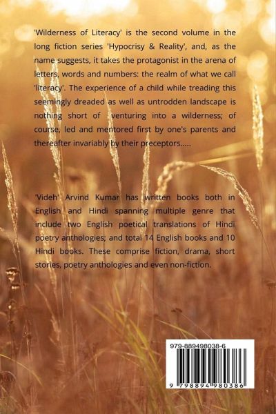 'Wilderness of Literacy' is the second volume in the long fiction series 'Hypocrisy & Reality' and, as the name suggests, it takes the protagonist in the arena of letters, words, and numbers: the realm of what we call the 'literacy'. The experience of a child while treading this seemingly dreaded as well as untrodden landscape is nothing short of venturing into a wilderness; of course, led and mentored first by one's parents and thereafter invariably by their preceptors -- the masters -- all of whom have a tremendous amount of impact on the future human being that emerges from their inputs given and endeavours made towards making a man, the humanity.
