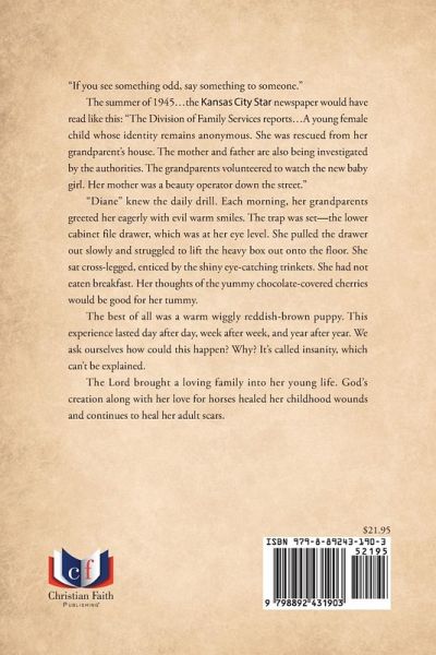 "If you see something odd, say something to someone." The summer of 1945...the Kansas City Star newspaper would have read like this: "The Division of Family Services reports...A young female child whose identity remains anonymous. She was rescued from her grandparent's house. The mother and father are also being investigated by the authorities. The grandparents volunteered to watch the new baby girl. Her mother was a beauty operator down the street." "Diane" knew the daily drill. Each morning, her grandparents greeted her eagerly with evil warm smiles. The trap was set--the lower cabinet file drawer, which was at her eye level. She pulled the drawer out slowly and struggled to lift the heavy box out onto the floor. She sat cross-legged, enticed by the shiny eye-catching trinkets. She had not eaten breakfast. Her thoughts of the yummy chocolate-covered cherries would be good for her tummy. The best of all was a warm wiggly reddish-brown puppy. This experience lasted day after day, week after week, and year after year. We ask ourselves how could this happen? Why? It's called insanity, which can't be explained. The Lord brought a loving family into her young life. God's creation along with her love for horses healed her childhood wounds and continues to heal her adult scars.