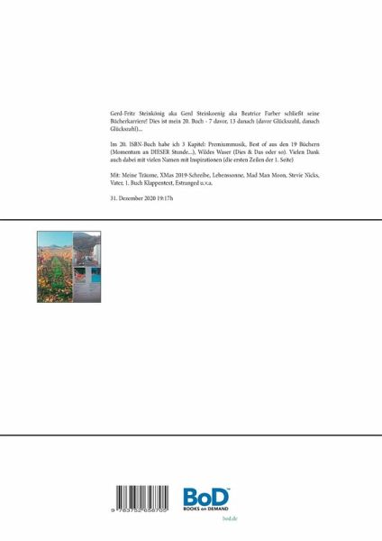 Gerd-Fritz Steinkönig aka Gerd Steinkoenig aka Beatrice Farber schließt seine Bücherkarriere! Dies ist mein 20. Buch - 7 davor, 13 danach (davor Glückszahl, danach Glückszahl)...Im 20. ISBN-Buch habe ich 3 Kapitel: Premiummusik, Best of aus den 19 Büchern (Momentum an DIESER Stunde...), Wildes Waser (Dies & Das oder so). Vielen Dank auch dabei mit vielen Namen mit Inspirationen (die ersten Zeilen der 1. Seite)Mit: Meine Träume, XMas 2019-Schreibe, Lebenssonne, Mad Man Moon, Stevie Nicks, Vater, 1. Buch Klappentext, Estranged u.v.a.31. Dezember 2020 19:17h