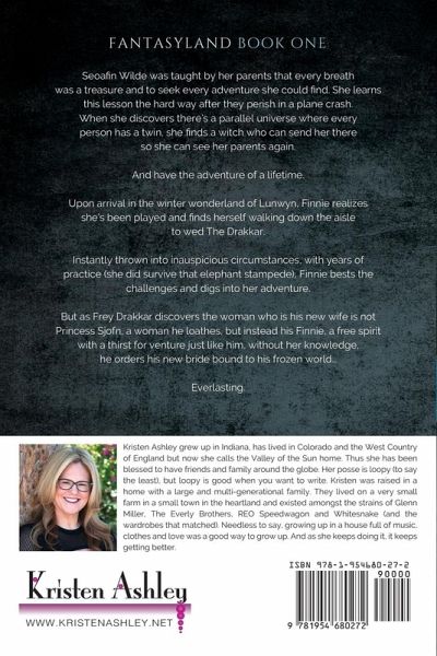 Seoafin "Finnie" Wilde was taught by her parents that life was meant to be lived, every breath was a treasure and to seek every adventure she could find. She learns this lesson the hard way when they perish in a plane crash when she's fifteen. But she never forgets, and when she discovers there's a parallel universe where every person has a twin, she finds a witch who can send her there so she can see her parents again and have the adventure of a lifetime. But nearly upon arrival in the winter wonderland of Lunwyn, she realizes she's been played by her twin of the alternate universe and shortly finds herself walking down the aisle to be wed to The Drakkar. Instantly thrown into inauspicious circumstances, with years of practice (she did, of course, survive that elephant stampede), Finnie bests the challenges and digs into her adventure. But as Frey Drakkar discovers the woman who is his new wife is not Princess Sjofn, a woman he dislikes (intensely), but instead his Finnie, a free spirit with a thirst for venture just like him (not to mention, she's his destiny), without her knowledge he orders his new bride bound to his frozen world...everlasting.