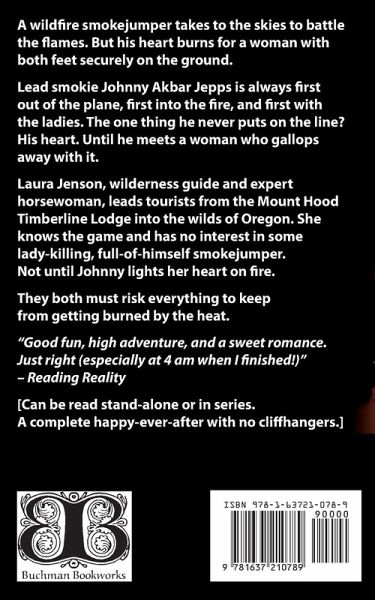 A wildfire smokejumper takes to the skies to battle the flames. But his heart burns for a woman with both feet securely on the ground. Lead smokie Johnny Akbar Jepps is always first out of the plane, first into the fire, and first with the ladies. The one thing he never puts on the line? His heart. Until he meets a woman who gallops away with it. Laura Jenson, wilderness guide and expert horsewoman, leads tourists from the Mount Hood Timberline Lodge into the wilds of Oregon. She knows the game and has no interest in some lady-killing, full-of-himself smokejumper. Not until Johnny lights her heart on fire. They both must risk everything to keep from getting burned by the heat. "Good fun, high adventure, and a sweet romance. Just right (especially at 4 am when I finished!)" - Reading Reality [Can be read stand-alone or in series. A complete happy-ever-after with no cliffhangers.] Buy now to jump into the romantic firefighting adventure.