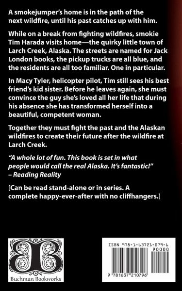 A smokejumper's home is in the path of the next wildfire, until his past catches up with him. While on a break from fighting wildfires, smokie Tim Harada visits home-the quirky little town of Larch Creek, Alaska. The streets are named for Jack London books, the pickup trucks are all blue, and the residents are all too familiar. One in particular. In Macy Tyler, helicopter pilot, Tim still sees his best friend's kid sister. Before he leaves again, she must convince the guy she's loved all her life that during his absence she has transformed herself into a beautiful, competent woman. Together they must fight the past and the Alaskan wildfires to create their future after the wildfire at Larch Creek. "A whole lot of fun. This book is set in what people would call the real Alaska. It's fantastic!" - Reading Reality [Can be read stand-alone or in series. A complete happy-ever-after with no cliffhangers.] Buy now to jump the romantic firefighting adventure.