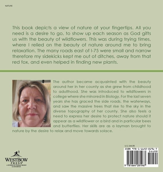 This book depicts a view of nature at your fingertips. All you need is a desire to go, to show up each season as God gifts us with the beauty of wildflowers. This was during trying times, where I relied on the beauty of nature around me to bring relaxation. The many roads east of I-75 were small and narrow therefore my sidekicks kept me out of ditches, away from that red fox, and even helped in finding new plants.