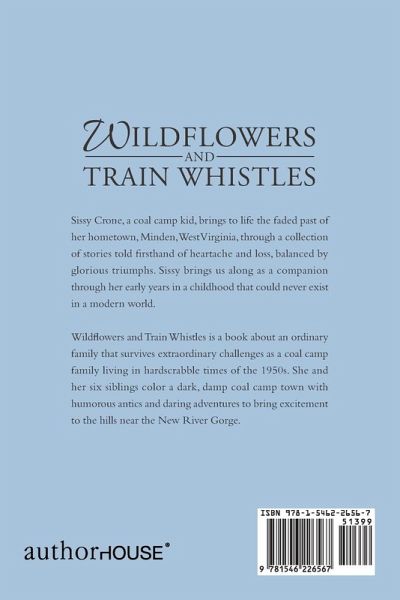 Sissy Crone, a coal camp kid, brings to life the faded past of her hometown, Minden, West Virginia, through a collection of stories told firsthand of heartache and loss, balanced by glorious triumphs. Sissy brings us along as a companion through her early years in a childhood that could never exist in a modern world. Wildflowers and Train Whistles is a book about an ordinary family that survives extraordinary challenges as a coal camp family living in hardscrabble times of the 1950s. She and her six siblings color a dark, damp coal camp town with humorous antics and daring adventures to bring excitement to the hills near the New River Gorge.