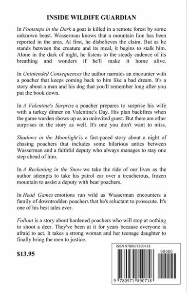 Praise for William Wasserman:"Perennial favorite William Wasserman is back with his sixth book. The stories from this retired 32-year veteran conservation officer just keep coming and are as entertaining and enlightening as ever. Wildlife Guardian is written in Wasserman's usual high-quality style that keeps you turning the pages until, before you know it, the book is done. Anyone who has not read any of Wasserman's books before could easily start with this one and work backwards, as they do not need to be read in any particular order, and they are all top-notch game warden non-fiction."-Gerry W. Lister, Editor, International Game Warden Magazine"His accounts read like scripts for a true-life reality television show. Murderers, drug addicts, dope dealers, and outlaw bikers have all crossed his path, to ends not of their liking." -Al Holliday, Editor, Pennsylvania Magazine"Wasserman is at his best when his stranger-than-fiction stories reveal their own truths."-Cheryl Moskaluk, Editor, The Alberta Game Warden"In more than 30 years he's encountered it all, from the most hardened criminals to the most unbelievable encounters with wildlife." -Robert C. Mitchell, Editor, Pennsylvania Game NewsDescription:This is Wasserman's third book about his encounters with animal poachers in the wilds of Pennsylvania. Join him as he patrols four-hundred square miles of rural mountain terrain in search of some of the most unpredictable-and interesting-characters you'll ever meet. Wasserman relates the dangers of his job with pulse-pounding clarity. He is a wonderful storyteller. His crisp use of dialog makes his characters come alive in every page. Wildlife Guardian contains six of his best tales to date. In Footsteps in the Dark, a goat is killed in a remote forest by an unknown creature. Wasserman knows that a huge mountain lion has been reported in the area. At first, he disbelieves the claim. But as he stands between the creature and its meal, it begins to stalk him. Alone, in the dark of night, he listens to the steady cadence of its breathing and wonders if he'll make it home alive.In Unintended Consequences, Wasserman narrates an encounter with a poacher that keeps coming back to him like a bad dream. It's a story about a man and his dog that you'll remember long after you put the book down.In A Valentine's Surprise, a poacher prepares to surprise his wife with a turkey dinner on Valentine's Day. His plan backfires when Wasserman shows up as an uninvited guest. But there are other surprises in the story as well. It's one you don't want to miss.In Shadows in the Moonlight, Wasserman encounters a potentially dangerous situation with two men who've been drinking heavily. It's a fast-paced story about a night of chasing poachers that includes some hilarious antics between Wasserman and a faithful deputy who always manages to stay one step ahead of him. In A Reckoning in the Snow, we take the ride of our lives as Wasserman attempts to take his patrol car over a treacherous frozen mountain without plunging to his death in order to assist a deputy with bear poachers.In Head Games, emotions run wild as Wasserman encounters a family of downtrodden poachers that he does not want to prosecute. It's the good, the bad, and the ugly of Muskrat Hollow. One of his best tales ever.Fallout is a story about hardened poachers who will stop at nothing to shoot a deer. They've been at it for years because everyone is afraid to report them. Wasserman and his deputy must seek the aid of a woman and her teenaged daughter in order to bring the men to justice. Excerpts from Wildlife Guardian:"I wondered if it was sizing me up at this very moment, its powerful body adjusting, muscles taut and ready. The notion made my heart hammer so loud I could actually hear it. And I was certain whatever was out there could too."