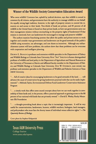In the United States, two-thirds of lands are private, and 85 percent of all wildlife is found on these private lands. Who is responsible for wildlife found on private lands--the government, who has the authority to manage wildlife on behalf of all citizens, or the landowners? How can governments carry out their management mission without encroaching on the property rights of landowners? How can landowners be encouraged to manage and preserve wildlife? The authors attempt to answer these questions, examining ways that public and private sectors can work together considering ways governments and landowners can be good stewards of the public's wildlife using recreation, tax advantages, and cost shares as incentives.