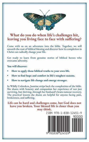 What do you do when life's challenges hit, leaving you living face to face with suffering? Come with us on an adventure into the bible. Together, we will unearth the root of biblical blessing and discover how its completion in Christ can radically change your life. Get ready to learn from genuine stories of biblical heroes who overcame adversity. You will discover:How to apply those biblical truths to your own life. How to find hope and comfort during life's toughest seasons. How to navigate life change and emerge stronger. In Wildly Unbroken, Jasmine strips back the complexities of the bible. She shares with honesty and compassion her experience of not just surviving, but thriving, through her husband's brain tumour recovery. The practical lessons she shares are helpful for anyone facing pain, brokenness, and suffering. Life can be hard and challenges come, but God does not leave you broken. Your blessed life is closer than you may think.