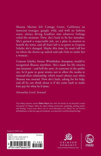 Shauna Marino left Cottage Grove, California an innocent teenager, gangly, wild, and with no fashion sense, always diving headfirst into whatever feelings ruled the moment. Now, she's back to fix her mistakes. She's gained a respectable job, set a plan in motion to benefit the town, and all that's left is to prove to Grayson Schyler she's changed. Maybe this time, he won't tell her no when she shows up naked and asks him to make her a woman. Grayson Schyler, former Wimbledon champion, would've recognized Shauna anywhere. She's made his life sweeter one moment - and hell the next. As someone in the public eye, he'd gone to great strains not to allow the media to misread their relationship, which wasn't always easy when Shauna was around. Now she's back, asking for his help, and all he can think about is if she came back to make him pay for what he'd done. Sensuality Level: Sensual