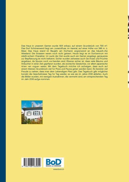 Das Haus in unserem Garten wurde 1901 erbaut, auf einem Grundstück von 790 m². Das Dorf Schönenwerd liegt am Jurasüdfuss, im Aaretal, auf einer Höhe von 386 m. ü. Meer. Das Haus stand im Baujahr am Dorfrand, angrenzend an das bäuerliche Wiesland. Die Straßen waren noch nicht geteert. Heute liegt es im Dorfzentrum mit städtischem Charakter. Im Laufe der Zeit wurde auch ein Garten angelegt, genaueres zur Bepflanzung ist nicht bekannt. Sicher wurden zeitweise auch Gemüse und Früchte angebaut, da Spuren noch vorhanden sind. Ebenso sicher ist, dass viele Bäume und Sträucher in einer Zeit gepflanzt wurden, als exotische Gewächse, vor allem japanische Arten "en vogue" waren. Mit dem Tagebuch möchte ich aufzeigen, dass auch auf einem kleinen Grundstück viel für Flora und Fauna getan werden kann. Es bereitet viel Freude zu sehen, dass man dem Lebendigen Platz gibt. Das Tagebuch gibt möglichst korrekt die Geschehnisse Tag für Tag wieder, so wie sie im Jahre 2018 abliefen. Auch die Bilder wurden, mit wenigen Ausnahmen, die vermerkt sind, am entsprechenden Tag im Jahr 2018 aufgenommen.