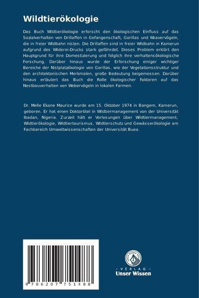 Das Buch Wildtierökologie erforscht den ökologischen Einfluss auf das Sozialverhalten von Drillaffen in Gefangenschaft, Gorillas und Weavervögeln, die in freier Wildbahn nisten. Die Drillaffen sind in freier Wildbahn in Kamerun aufgrund des Wilderei-Drucks stark gefährdet. Dieses Problem erklärt den Hauptgrund für ihre Domestizierung und folglich ihre verhaltensökologische Forschung. Darüber hinaus wurde der Erforschung einiger wichtiger Bereiche der Nistplatzökologie von Gorillas, wie der Vegetationsstruktur und den architektonischen Merkmalen, große Bedeutung beigemessen. Darüber hinaus erläutert das Buch die Rolle ökologischer Faktoren auf das Nestbauverhalten von Webervögeln in lokalen Farmen.