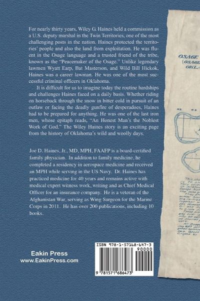 For nearly thirty years, Wiley G. Haines held a commission as a U.S. deputy marshal in the Twin Territories. One of the most challenging posts in the nation. Haines protected the territories' people and also the land from exploitation. He was fluent in the Osage language and a trusted friend of the tribe, known as the "Peacemaker of the Osage." Unlike legendary lawmen Wyatt Earp, Bat Masterson, and Wild Bill Hickok, Haines was a career lawman. He was one of the most successful criminal officers in Oklahoma. lt is difficult for us to imagine today the routine hardships and challenges Haines faced on a daily basis. Whether riding on horseback through the snow in bitter cold in pursuit of an outlaw, or facing the deadly gunfire of desperados. Haines had to be prepared for anything. He was one of the last iron men, whose epitaph reads, "An Honest Man's the Noblest Work of God," The Wiley Haines story is an exciting page from the history of Oklahoma's wild and woolly days.