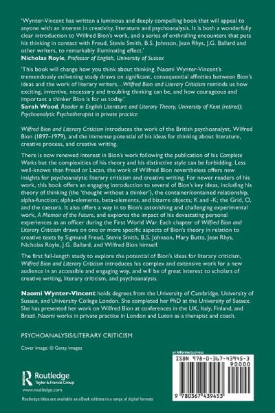 Wilfred Bion and Literary Criticism introduces the work of the British psychoanalyst, Wilfred Bion (1897-1979), and the immense potential of his ideas for thinking about literature, creative process, and creative writing. There is now renewed interest in Bion's work following the publication of his Complete Works but the complexities of his theory and his distinctive style can be forbidding. Less well-known than Freud or Lacan, the work of Wilfred Bion nevertheless offers new insights for psychoanalytic literary criticism and creative writing. For newer readers of his work, this book offers an engaging introduction to several of Bion's key ideas, including his theory of thinking (the 'thought without a thinker'), the container/contained relationship, alpha-function; alpha-elements, beta-elements, and bizarre objects; K and -K; the Grid, O, and the caesura. It also offers a way in to Bion's astonishing and challenging experimental work, A Memoir of the Future, and explores the impact of his devastating personal experiences as an officer during the First World War. Each chapter of Wilfred Bion and Literary Criticism draws on one or more specific aspects of Bion's theory in relation to creative texts by Sigmund Freud, Stevie Smith, B.S. Johnson, Mary Butts, Jean Rhys, Nicholas Royle, J.G. Ballard, and Wilfred Bion himself. The first full-length study to explore the potential of Bion's ideas for literary criticism, Wilfred Bion and Literary Criticism introduces his complex and extensive work for a new audience in an accessible and engaging way, and will be of great interest to scholars of creative writing, literary criticism, and psychoanalysis.