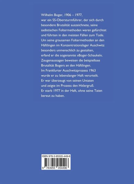 Wilhelm Boger, 1906 - 1977, war ein SS-Obersturmführer, der sich durch besondere Brutalität auszeichnete, seine sadistischen Foltermethoden waren gefürchtet und führten in den meisten Fällen zum Tode. Um seine grausamen Foltermethoden an den Häftlingen im Konzentrationslager Auschwitz besonders unmenschlich zu gestalten, erfand er die sogenannte »Boger-Schaukel«. Zeugenaussagen beweisen die beispiellose Brutalität Bogers an den Häftlingen. Im Frankfurter Auschwitzprozess 1963 wurde er zu lebenslanger Haft verurteilt. Er war überzeugt von seinen Untaten und zeigte im Prozess den Hitlergruß. Er starb 1977 in der Haft, ohne seine Taten bereut zu haben.