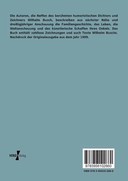 Die Autoren, die Neffen des berühmten humoristischen Dichters und Zeichners Wilhelm Busch, beschreiben aus nächster Nähe und dreißigjähriger Anschauung die Familiengeschichte, das Leben, die Weltanschauung und das künstlerische Schaffen ihres Onkels. Das Buch enthält zahllose Zeichnungen und auch Texte Wilhelm Buschs. Nachdruck der Originalausgabe aus dem Jahr 1909.
