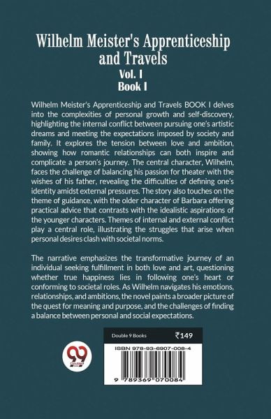 Wilhelm Meister's Apprenticeship and Travels BOOK I delves into the complexities of personal growth and self-discovery, highlighting the internal conflict between pursuing one's artistic dreams and meeting the expectations imposed by society and family. It explores the tension between love and ambition, showing how romantic relationships can both inspire and complicate a person's journey. The central character, Wilhelm, faces the challenge of balancing his passion for theater with the wishes of his father, revealing the difficulties of defining one's identity amidst external pressures. The story also touches on the theme of guidance, with the older character of Barbara offering practical advice that contrasts with the idealistic aspirations of the younger characters. Themes of internal and external conflict play a central role, illustrating the struggles that arise when personal desires clash with societal norms. The narrative emphasizes the transformative journey of an individual seeking fulfillment in both love and art, questioning whether true happiness lies in following one's heart or conforming to societal roles. As Wilhelm navigates his emotions, relationships, and ambitions, the novel paints a broader picture of the quest for meaning and purpose, and the challenges of finding a balance between personal and social expectations.