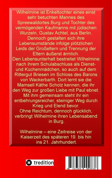 Wilhelmine ist Enkeltochter eines einst sehr betuchten Mannes des Spreewaldortes Burg und Tochter des Berliner Kaufmanns Gustav Achtel aus Berlin. Dennoch gestalten sich ihre Lebensumstände infolge plötzlichen Leids der Großeltern und Trennung der Eltern äußerst ärmlich.Den Lebensunterhalt bestreitet Wilhelmine nach ihrem Schulabschluss als Dienst- und Küchenmädchen, so auch auf dem Rittergut Briesen im Schloss des Baronsvon Wackerbarth. Dort lernt sie die Mamsell Käthe Scholz kennen, die ihr den Weg zur großen Liebe mit Paul ebnet. Mit ihm gemeinsam steht ihr einentbehrungsreicher, steiniger Weg durch Krieg und Elend bevor. Ohne Reichtum, dennoch glücklich, verbringt Wilhelmine ihren Lebensabend in Burg.Wilhelmine - eine Zeitreise von der Kaiserzeit des späteren 19. bis hin ins 21. Jahrhundert.