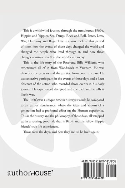 This is a whirlwind journey through the tumultuous 1960's. Hippies and Yippies. Sex, Drugs, Rock and Roll. Peace, Love, War, Harmony and Rage. This is a look back at that period of time, how the events of those days changed the world and changed the people who lived through it, and how those changes continue to effect the world even today. This is the life-story of the Reverend Billy Williams who experienced all of it, from Woodstock to Vietnam. He was there for the protests and the parties, from coast to coast. He was an active participant in the events of those days and a keen observer of the action who recorded those events in his daily journal. He experienced the good and the bad, and he tells it like it was. The 1960's was a unique time in history; it could be compared to an earlier Renaissance, where the ideas and actions of a generation had a profound effect on the Human experience. This is the history and the philosophy of those days, all wrapped up in a rousing good tale that is Billy's and his fellow Hippie friends' true life experiences. Those were the days, and here they are, to be lived again.