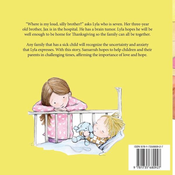 "Where is my loud, silly brother?" asks Lyla who is seven. Her three-year old brother, Jax is in the hospital. He has a brain tumor. Lyla hopes he will be well enough to be home for Thanksgiving so the family can all be together. Any family that has a sick child will recognize the uncertainty and anxiety that Lyla expresses. With this story, Samarrah hopes to help children and their parents in challenging times, affirming the importance of love and hope.