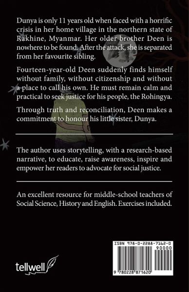 Dunya is only 11 years old when faced with a horrific crisis in her home village in the northern state of Rakhine, Myanmar. Her older brother Deen is nowhere to be found. After the attack, she is separated from her favourite sibling. Fourteen-year-old Deen suddenly finds himself without family, without citizenship and without a place to call his own. He must remain calm and practical to seek justice for his people, the Rohingya. Through truth and reconciliation, Deen makes a commitment to honour his little sister, Dunya. ---------------------------------------------------------- An excellent resource for middle-school teachers of English, History and Social Science. Homework exercises included. ---------------------------------------------------------- All proceeds from the sale of this book will be donated to the Rohingya Student Education Fund through the Rohingya Centre of Canada.