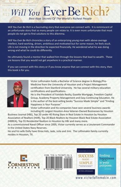 Will You Ever Be Rich is a fascinating story that everyone can connect with. It is reminiscent of an unfortunate story that so many people can relate to. It is even more unfortunate that most people do not get to find solutions to this dilemma. Will You Ever Be Rich chronicles a story of an enterprising young man with above-average intellect, hard-working, driven, ambitious and motivated but for some reason, he feels stuck. Life is not moving in the direction he expected financially. He wondered what he was doing wrong and what he could do differently. He ultimately found a mentor that walked him through the lessons that lead to wealth. These are lessons that you would not get anywhere in a practical manner. If you can connect with this story or if you know anyone that can connect with this story, then this book is for you. Victor Lofinmakin holds a Bachelor of Science degree in Biology/Pre-Medicine from the University of Houston and a Project Management certification from Stanford University. He has several military education certifications and qualifications. He is the President of Fairdale Realty, Gazette Mortgage, Freedom Capital Group, Academy Property Management and Easy Continuing Education. He is the author of the best-selling books "Success Made Simple" and "Finding Happiness Is Your Purpose." Victor Lofinmakin and his companies have won several business awards including #1 Largest Houston-Area Veteran-Owned Businesses by Houton Business Journal (HBJ), Top 20 under 40 Rising Stars in Real Estate in Houston by Houston Association of Realtors (HAR), Top 20 Black Realtors by Houston Black Real Estate Association (HBREA), Top 55 Residential Realtors in Houston by HBJ and many more. As a commissioned Naval Officer since 2005, Victor currently serves as a Lieutenant Commander in the United States Navy Reserves. He and his wife Dolly have three kids, Jade, Julia and Jimi. The Lofinmakin family currently resides in Houston, TX.