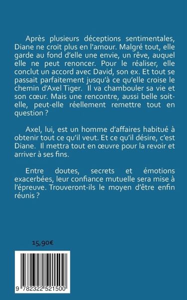 Après plusieurs déceptions sentimentales, Diane ne croit plus en l'amour. Malgré tout, elle garde au fond d'elle une envie, un rêve, auquel elle ne peut renoncer. Pour le réaliser, elle conclut un accord avec David, son ex. Et tout se passait parfaitement jusqu'à ce qu'elle croise le chemin d'Axel Tiger. Il va chambouler sa vie et son coeur. Mais une rencontre, aussi belle soit-elle, peut-elle réellement tout remettre en question ?Axel, lui, est un homme d'affaires habitué à obtenir tout ce qu'il veut. Et ce qu'il désire, c'est Diane. Il mettra tout en oeuvre pour la revoir et arriver à ses fins.Entre doutes, secrets et émotions exacerbées, leur confiance mutuelle sera mise à l'épreuve. Trouveront-ils le moyen d'être enfin réunis ?