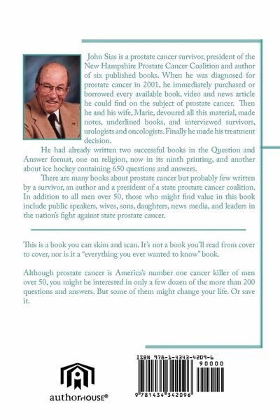 John Sias is a prostate cancer survivor, president of the New Hampshire Prostate Cancer Coalition and author of six published books. When he was diagnosed for prostate cancer in 2001, he immediately purchased or borrowed every available book, video and news article he could find on the subject of prostate cancer. Then he and his wife, Marie, devoured all this material, made notes, underlined books, and interviewed survivors, urologists and oncologists. Finally he made his treatment decision. He had already written two successful books in the Question and Answer format, one on religion, now in its ninth printing, and another about ice hockey containing 650 questions and answers. There are many books about prostate cancer but probably few written by a survivor, an author and a president of a state prostate cancer coalition. In addition to all men over 50, those who might find value in this book include public speakers, wives, sons, daughters, news media, and leaders in the nation's fight against state prostate cancer. "Easy to understand." "I can find what I want to know without having to wade through an entire book." This is a book you can skim and scan. It's not a book you'll read from cover to cover, nor is it a "everything you ever wanted to know" book. Although prostate cancer is America's number one cancer killer of men over 50, you might be interested in only a few dozen of the more than 200 questions and answers. But some of them might change your life. Or save it.