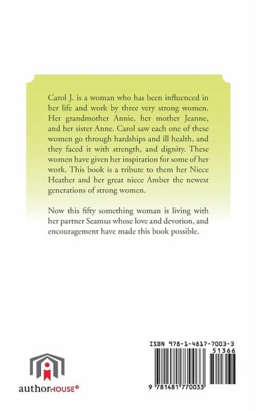 Carol J. is a woman who has been influenced in her life and work by three very strong women. Her grandmother Annie, her mother Jeanne, and her sister Anne. Carol saw each one of these women go through hardships and ill health, and they faced it with strength, and dignity. These women have given her inspiration for some of her work. This book is a tribute to them her Niece Heather and her great niece Amber the newest generations of strong women. Now this fifty something woman is living with her partner Seamus whose love and devotion, and encouragement have made this book possible.