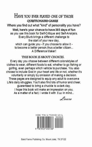 This book presents help in making life choices, big and small. Blurbs on any given page will help you make choices when the unexpected happens. We all have days that are reminiscent of a roller-coaster ride, up and down, fun and scary. God and a sense of humor help cope with these days and may change a negative to a positive.