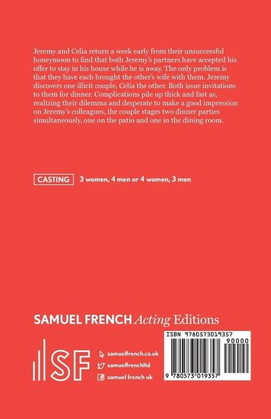 Jeremy and Celia return a week early from their unsuccessful honeymoon to find that both Jeremy's partners have accepted his offer to stay in his house while he is away. The only problem is that they have each brought the other's wife with them. Jeremy discovers one illicit couple, Celia the other. Both issue invitations to them for dinner. Complications pile up thick and fast as, realizing their dilemma and desperate to make a good impression on Jeremy's colleagues, the couple stages two dinner parties simultaneously, one on the patio and one in the dining room.-3 women, 4 men or 4 women, 3 men