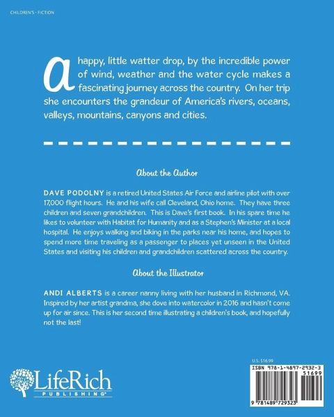 A happy, little watter drop, by the incredible power of wind, weather and the water cycle makes a fascinating journey across the country. On her trip she encounters the grandeur of America's rivers, oceans, valleys, mountains, canyons and cities.