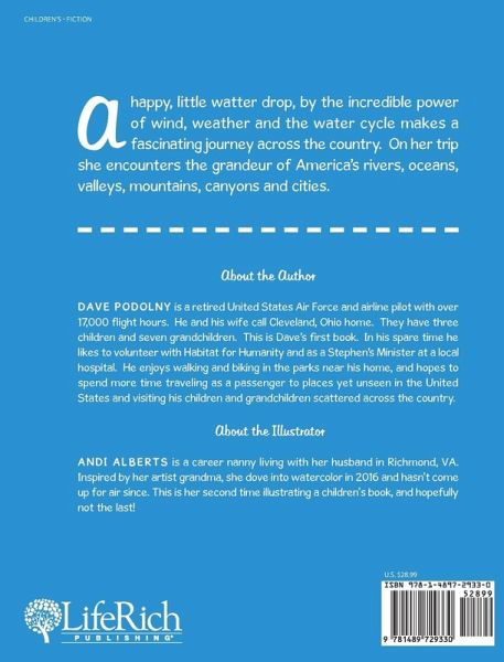 A happy, little watter drop, by the incredible power of wind, weather and the water cycle makes a fascinating journey across the country. On her trip she encounters the grandeur of America's rivers, oceans, valleys, mountains, canyons and cities.